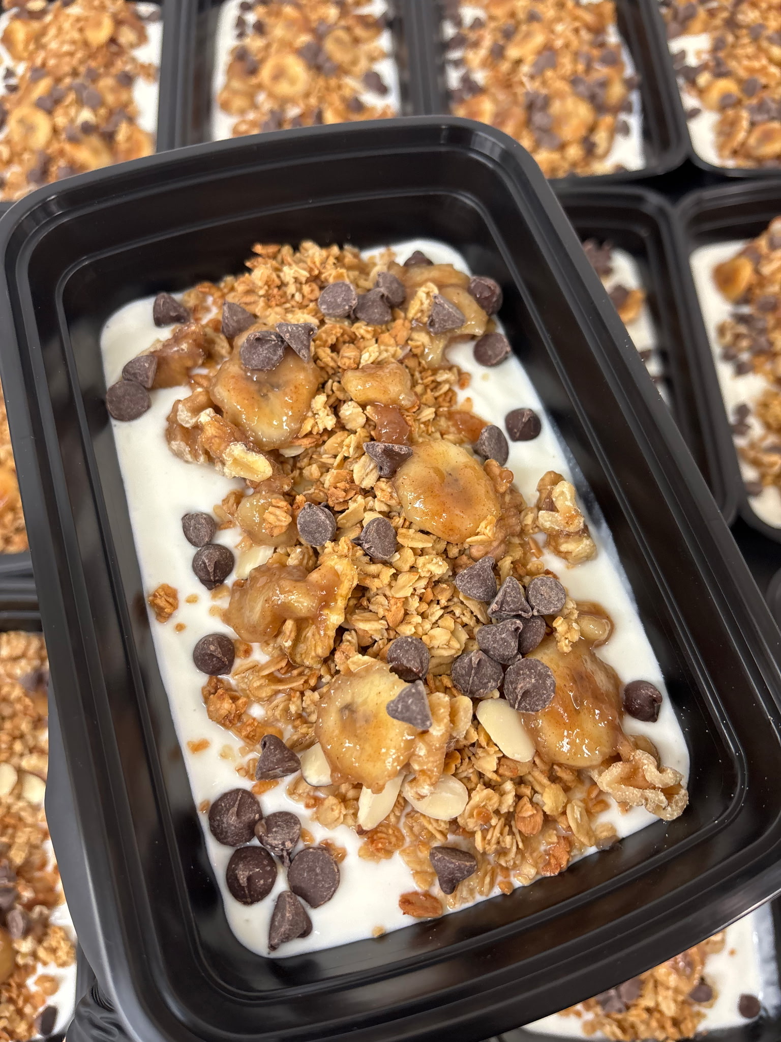 Greek Yogurt, Splenda, Banana, Honey, Chocolate Chips, Walnuts, Granola, Cinnamon, Vanilla Extract