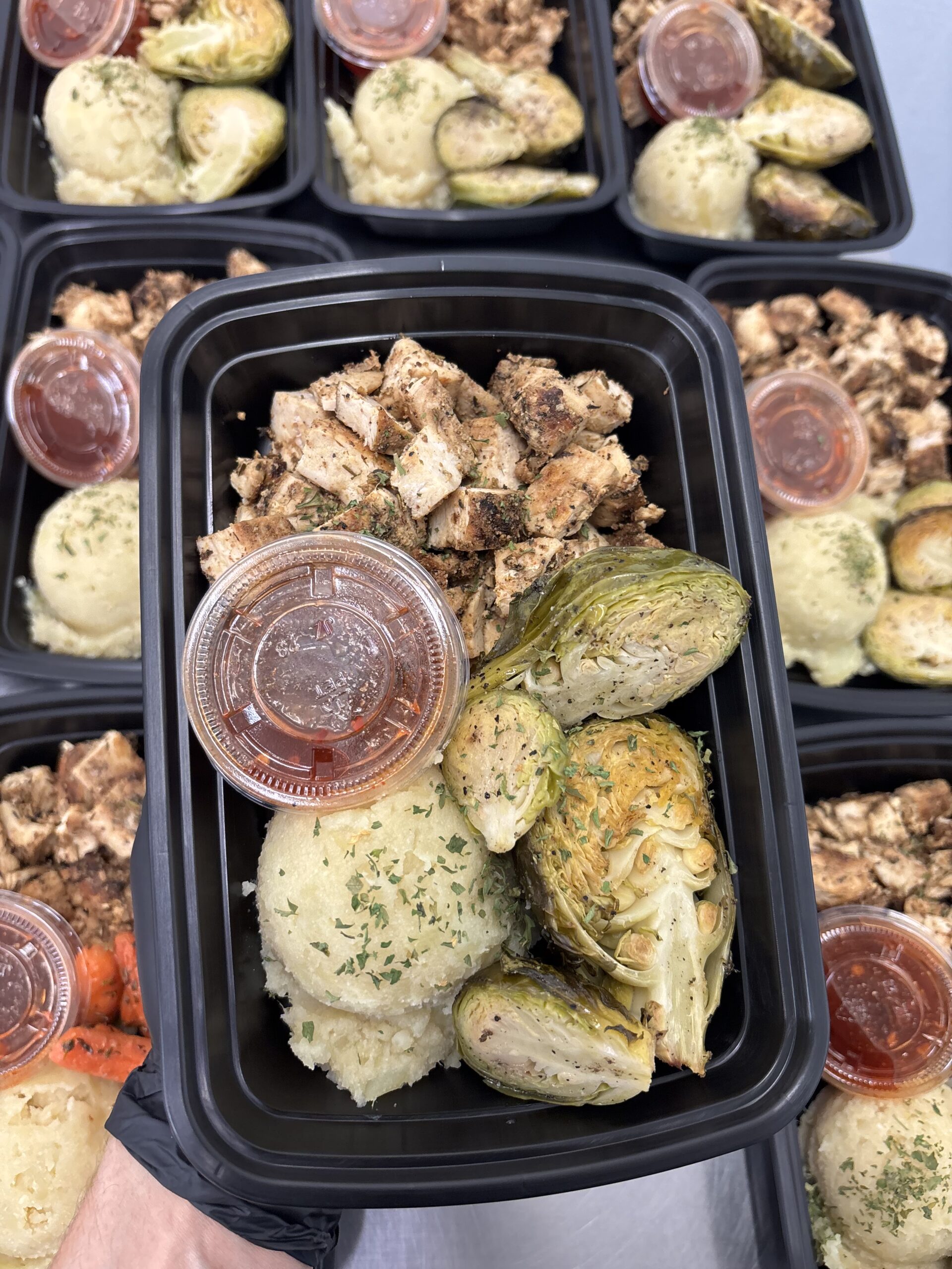 Chicken Breast, Sweet Potato Mashed Potatoes, Butter, Brown Sugar, Brussels Sprouts, Mike’s Hot Honey, Olive Oil