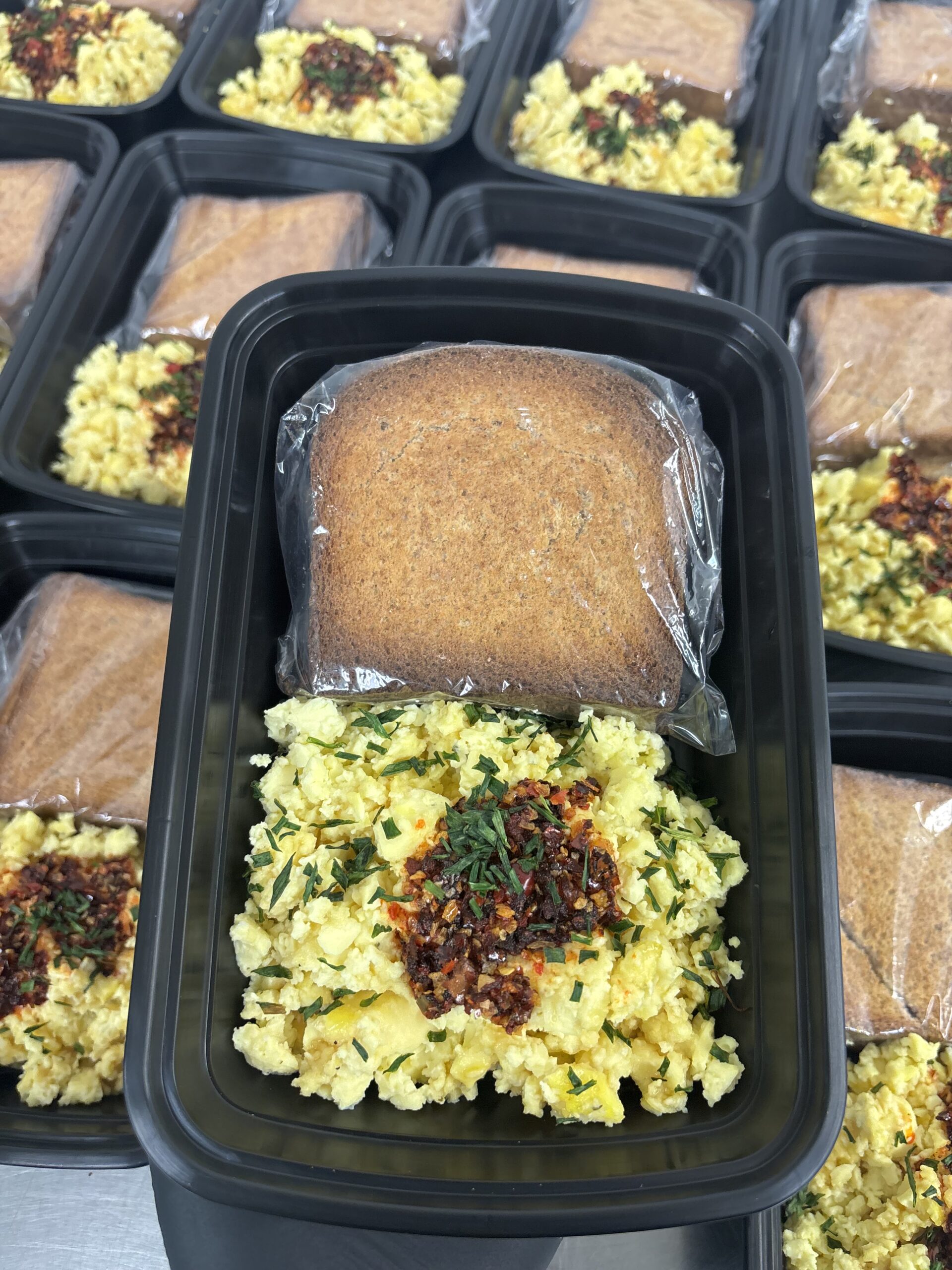 Whole Eggs, Boursin Cheese (Garlic & Fine Herbs), Whole Grain Toast, Hot Honey, Chives, Chili Crisp