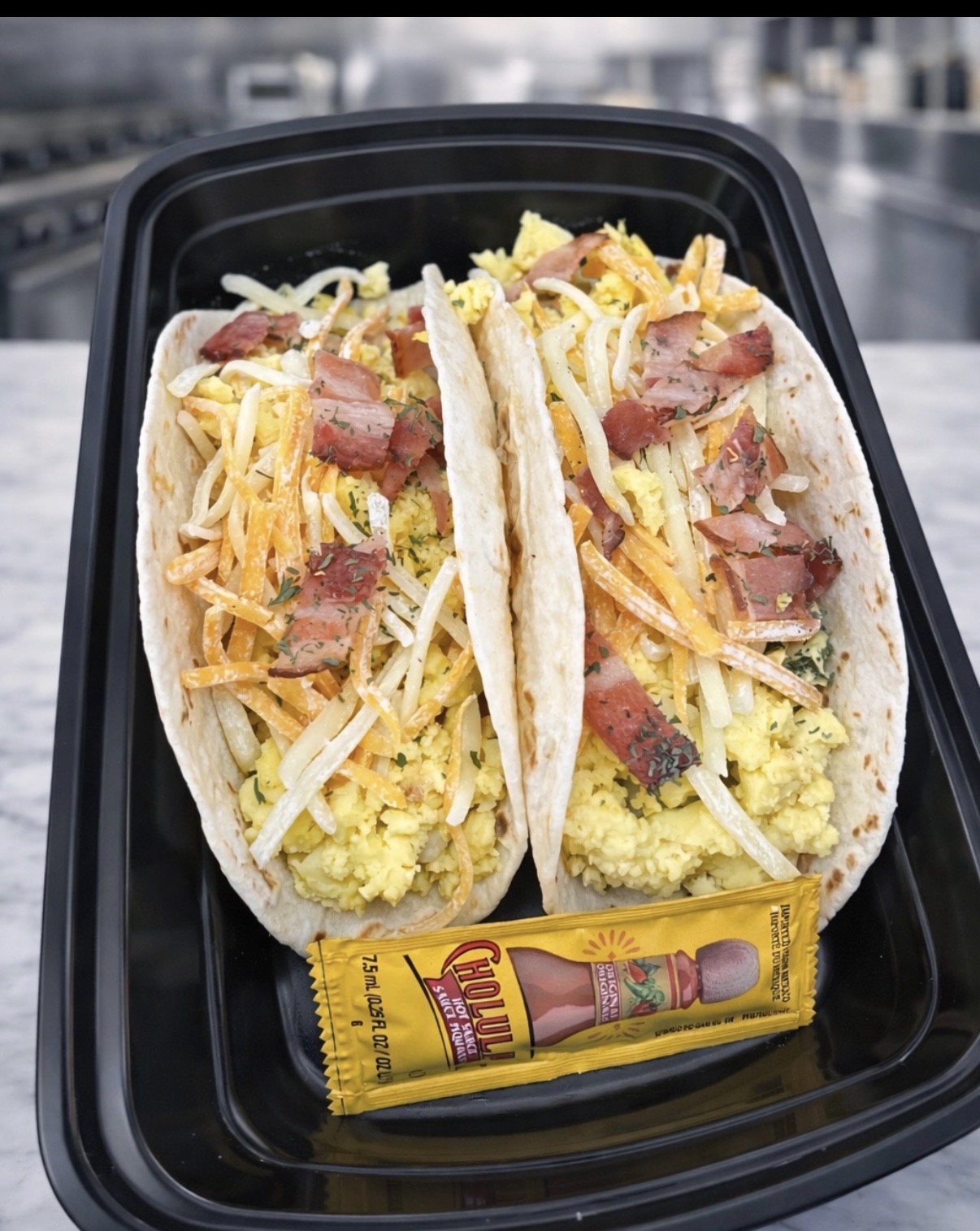 Whole Eggs, Flour Tortilla, Turkey Bacon, Cheddar Cheese, Roasted Potatoes, Tapatio Packet, Olive Oil, Seasonings