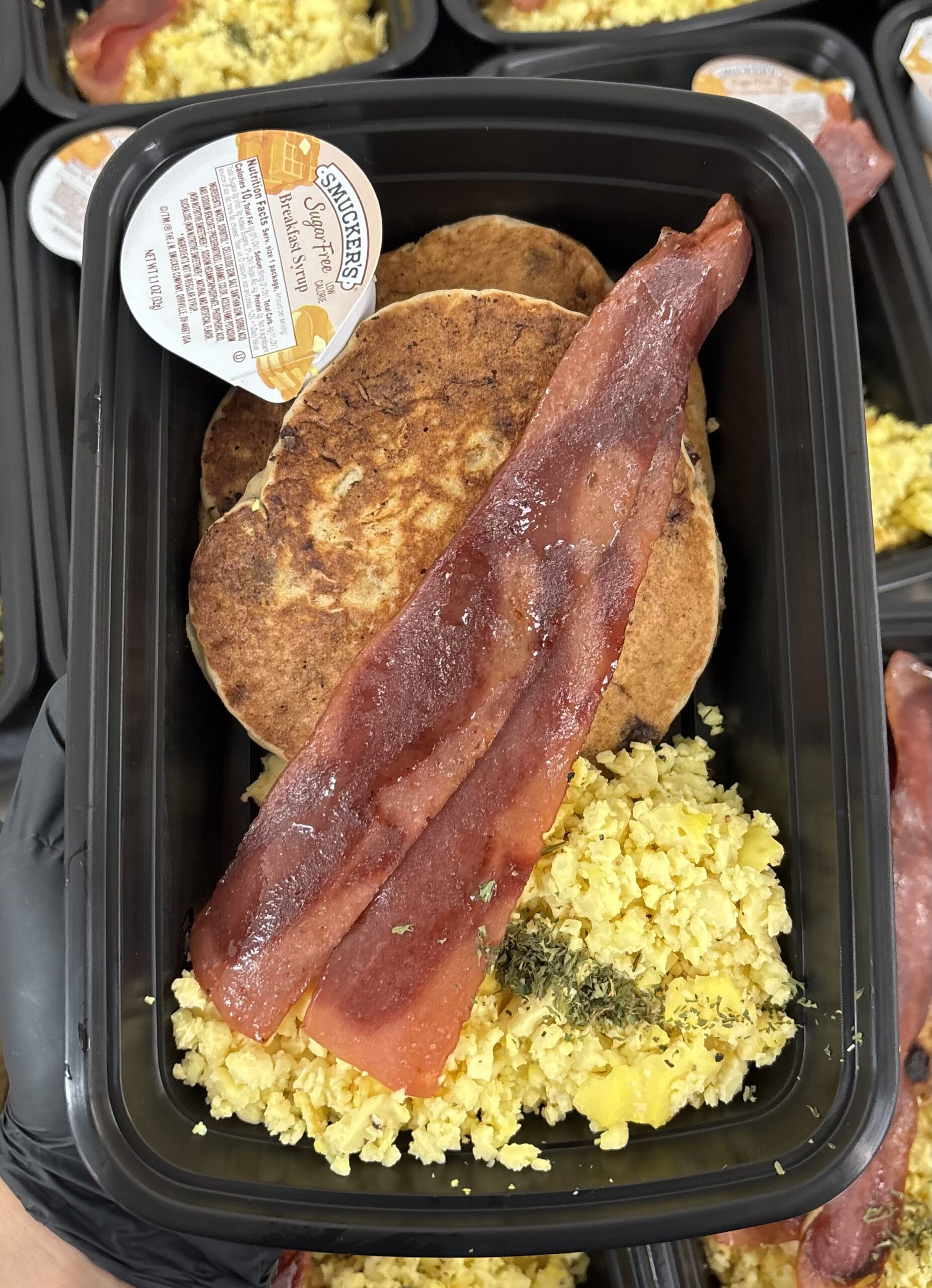 Oats, Banana, Vanilla Whey Protein Powder, Cinnamon, Mini Chocolate Chips.Whole Eggs, Turkey Bacon