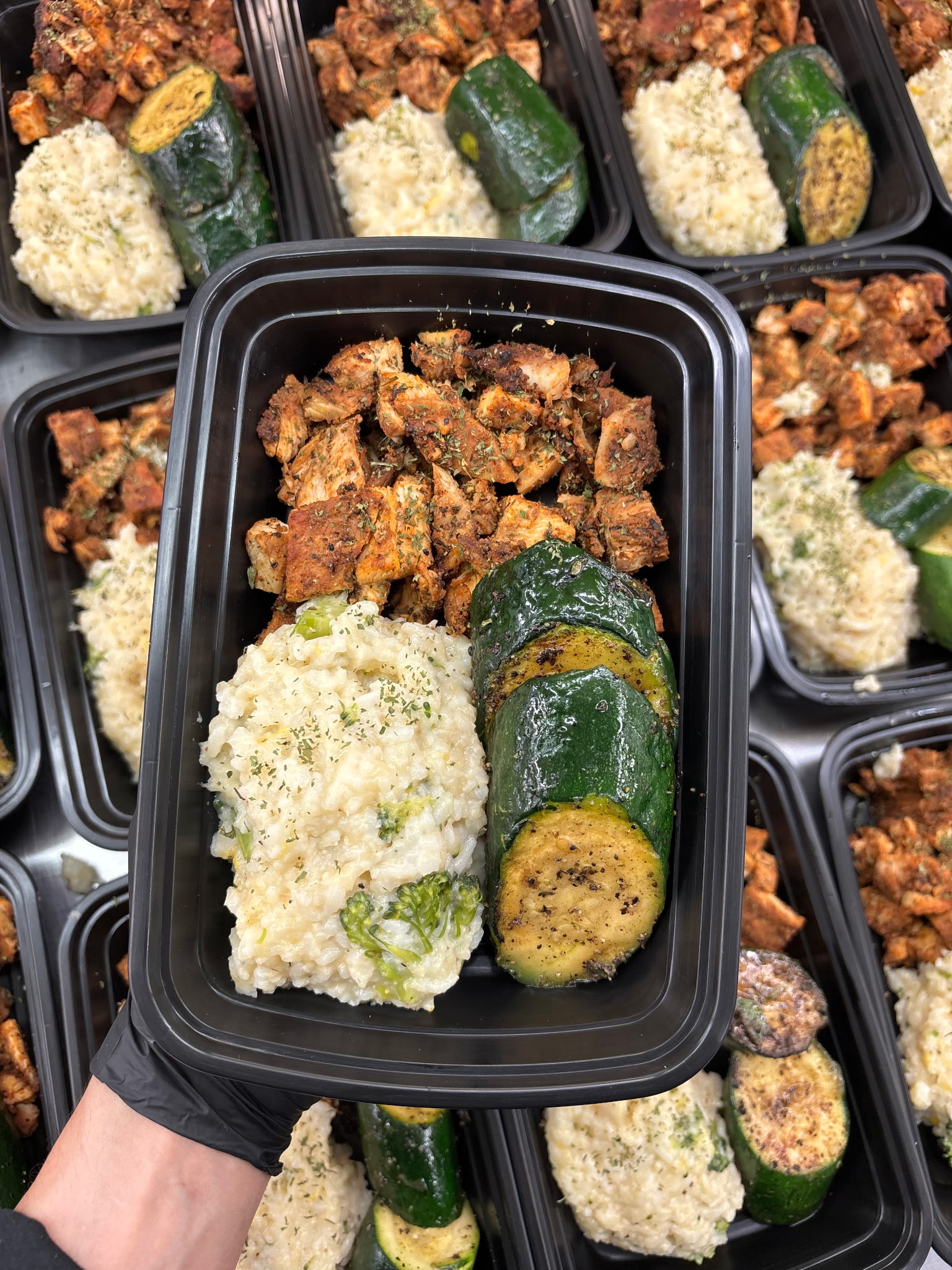 Chicken Breast, Jasmine Rice, Chicken Bouillon, Broccoli, Cheddar Jack Cheese, Roasted Vegetables, Olive Oil, Black Pepper