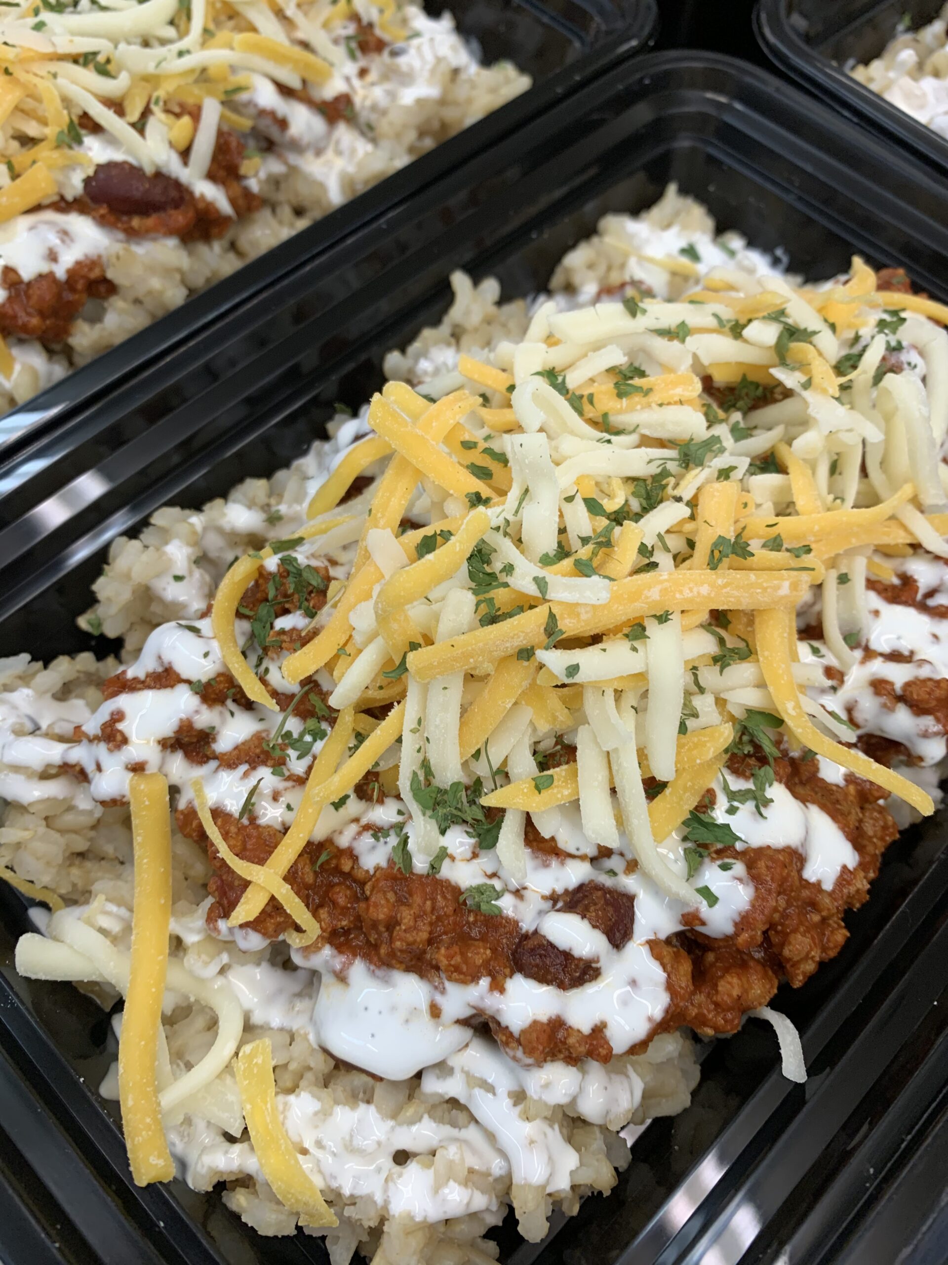 Lean Ground Turkey, Chicken Stock,Brown Rice, Kidney Beans, Mexican Crema, Cheddar Cheese, Tomato Sauce, Chili Seasoning