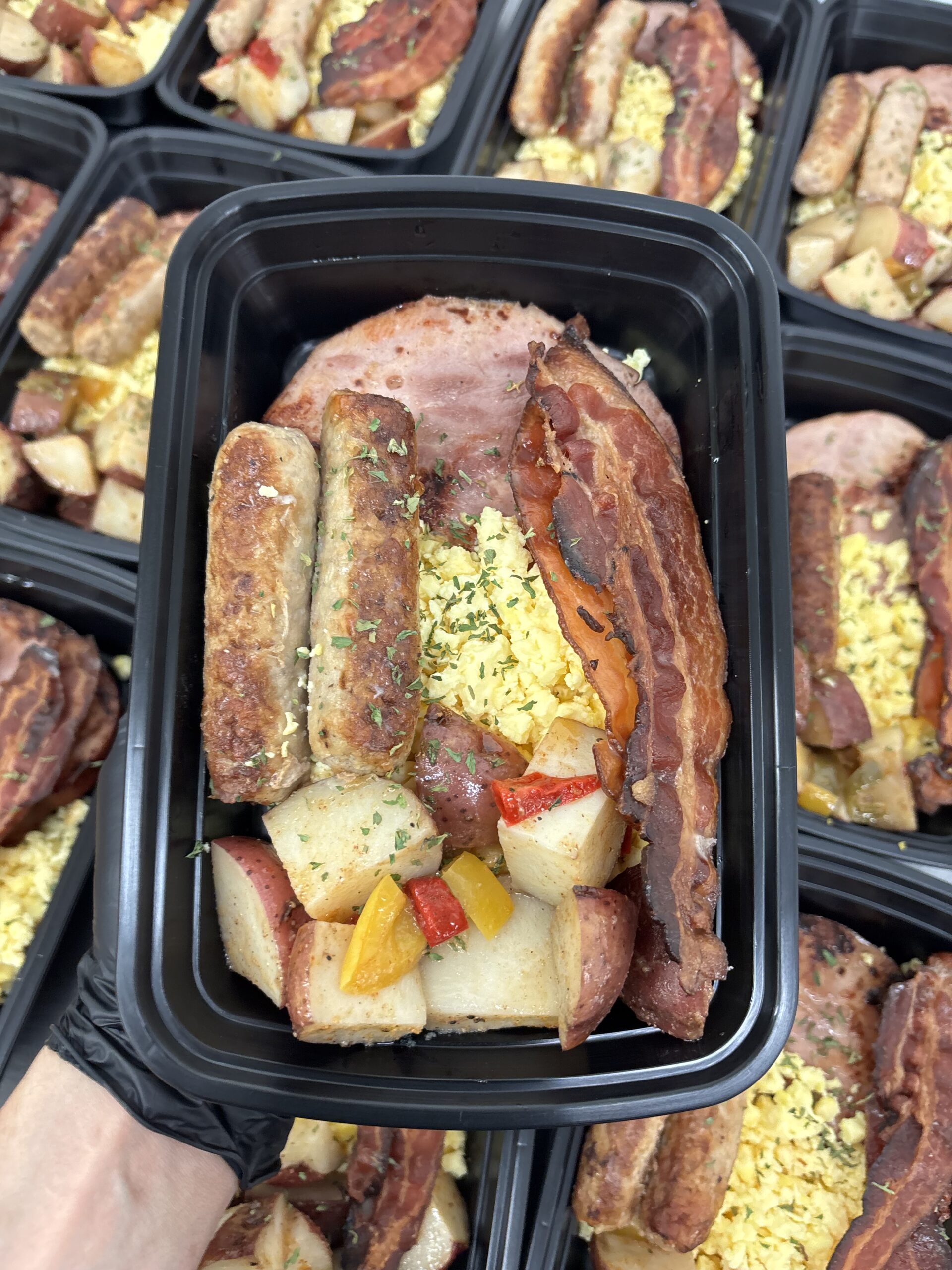 Honey Ham, Pork Sausage Links, Bacon, Whole Eggs, Shredded Hashbrowns, Salt, Black Pepper, Nonstick Cooking Spray