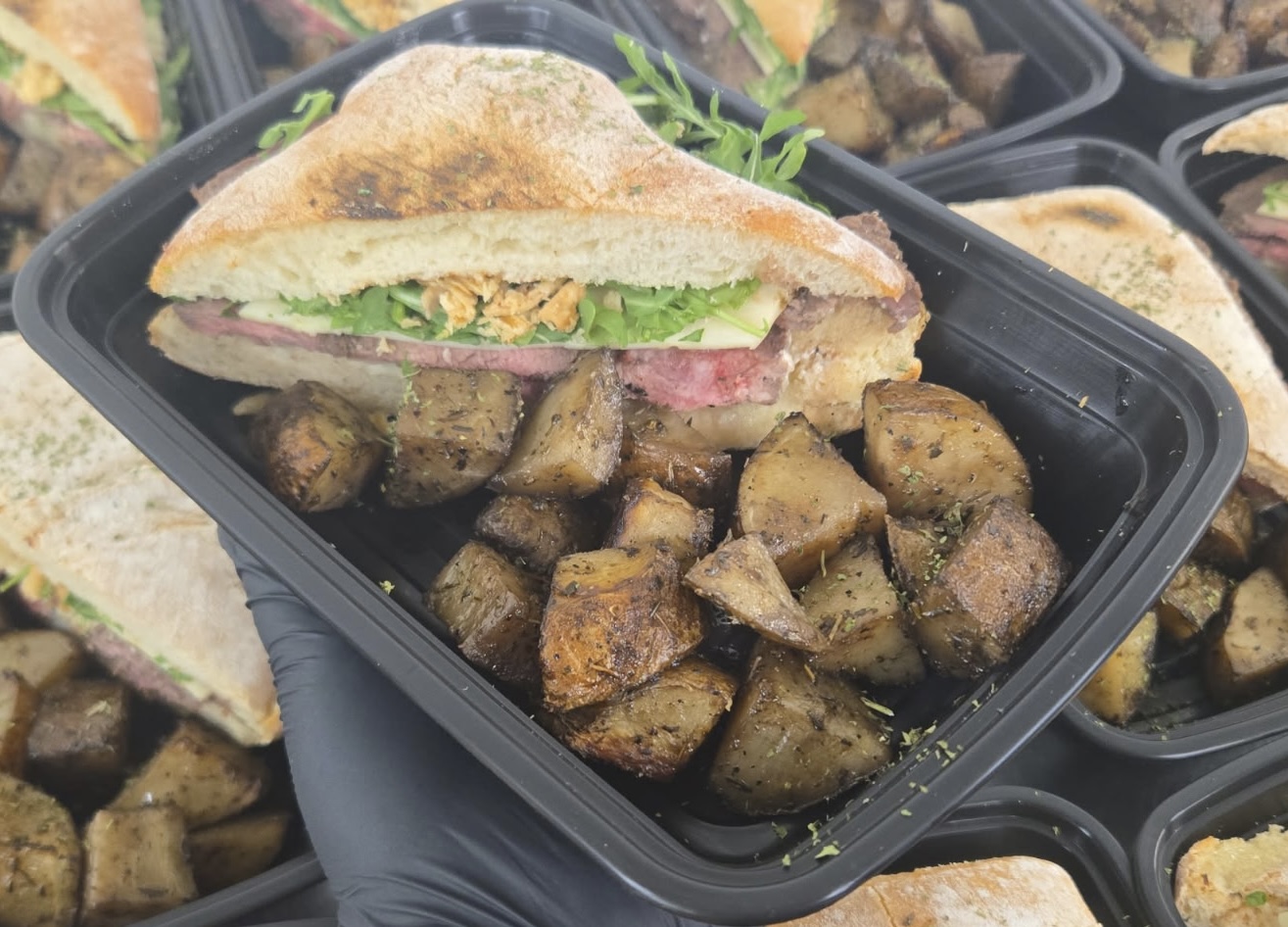 Ciabatta Roll, Top Sirloin, Pepper-Jack, Mayo, Arugula, Crispy Onions, Red Potatoes, Salt, Pepper