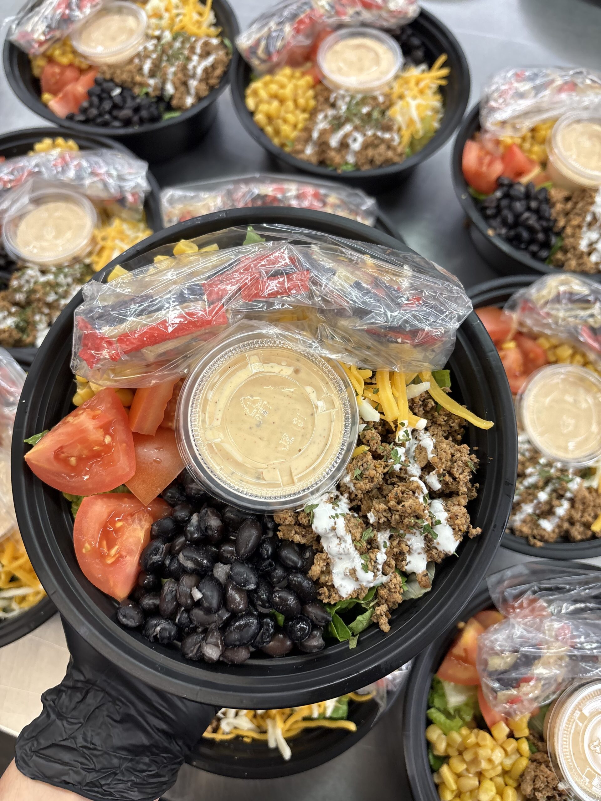 Romaine Lettuce, Lean Ground Turkey, Black Beans, Corn, Tomatoes, Taco Seasoning, Mexican Crema, Cheddar Jack Cheese